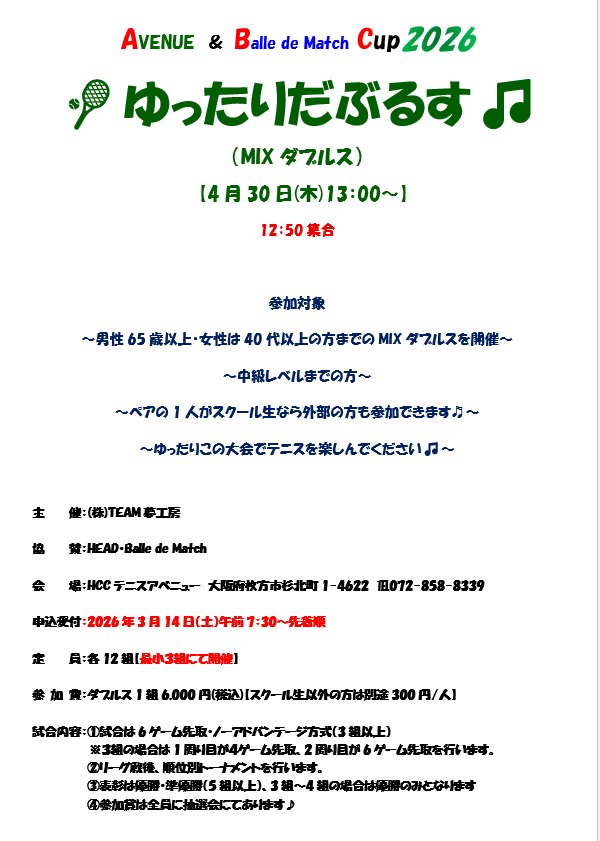 - 2026.01.06 NEW2026年BALLEDEMATCH CUP(new65歳男子ダブルス等)大会案内