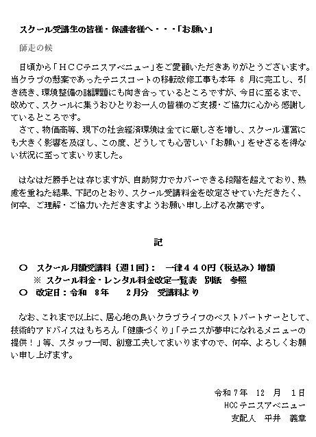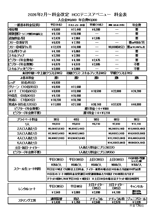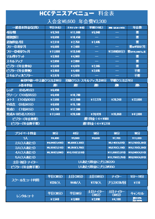 レンタルコート料金・サークル利用・スクール生コート利用 レンタルコート平日 3,080円/時間土日・ナイター 4,180円/時間 ★随時受け付けております。 ★キャンセル前日50%・当日100%発生いたします。サークル利用(半年契約) ★半年契約でコートをお安く借りることができます。 ★1時間平日1,650円でご利用できます。 ★詳細はお問い合わせください。スクール生コート利用(スクール生特典) ★平日9:00~17:00の間は1人30分220円でご利用できます ★土日は1人30分440円・60分770円でご利用できます。 ★スクール生の御家族ならいつでも 30分440円・60分770円でご利用できます ★照明利用の場合は別途220円発生致します。 サークル利用 スクール生コート利用