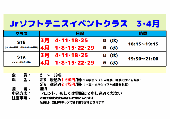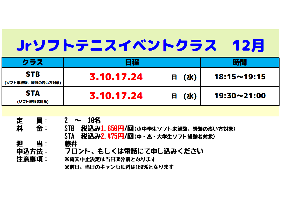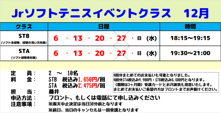 STB(60分10名)1,650円(税込)/回⇒ソフト未経験、経験の浅いジュニア対象